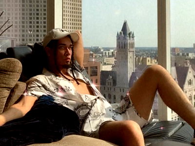 Milwaukee model Royal Montana exudes confidence and style in this image. Shot in a spacious room with white walls and wooden floors, he strikes a pose that highlights his athletic build and vibrant personality. Wearing a sleek white tank top and sporting a pair of black sneakers, he showcases his trendy fashion sense.