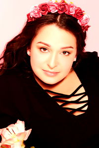 This image showcases Ruby, a stunning OnlyFans model who exudes allure and beauty. Her floral-themed photoshoot is accentuated by her long dark hair cascading around her face. The roses in the background add an extra touch of elegance to this portrait.