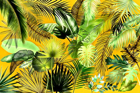 A vibrant and lively tropical scene featuring various types of plants against a yellow background, showcasing an array of colors and textures.