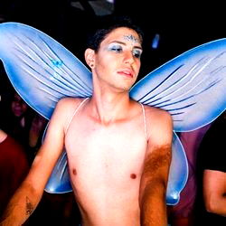 A lively nightlife ambiance features a shirtless man striking a pose, adorned with glittering butterfly wings. The crowd of partygoers adds to the energetic atmosphere.