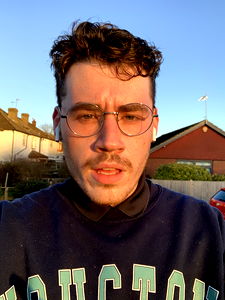 Sammy, a young man from UK, stands in front of his house. He has short hair, is wearing glasses and a sweatshirt. His facial expression suggests surprise or amusement.