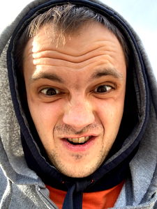 A man with a beard and mustache, wearing a gray hoodie, making an amused facial expression. He appears to be outdoors during the day.