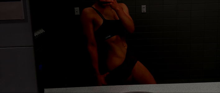 In this photo, the OnlyFans model Sarina is captured mid-pose, showcasing her athletic attire. The vivid green and yellow bikini contrasts beautifully against the dark background, highlighting her toned physique.