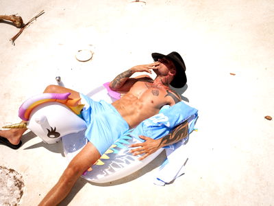 In this beach-themed photo, Onlyfans model Scott Nails is the center of attention. He is casually lounging on a pool float, sporting a blue shirt that matches his swim trunks, and holding a drink. His relaxed demeanor suggests a day filled with leisure and fun in the sun. The tropical backdrop adds to the vacation vibe.