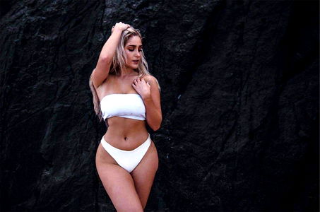 Little Miss Taylor, a captivating model from the OnlyFans platform, is captured in a sensational swimsuit pose on a rocky backdrop. Her allure is undeniable as she confidently poses in her white bikini.
