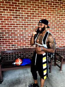 The image shows a young male, presumably the model 'Semaj', standing outdoors. He is wearing casual attire and appears to be enjoying a sunny day. The background features a road with cars parked along it, suggesting an urban or suburban setting.