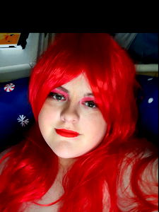 A beautiful woman with vibrant red hair and makeup, striking a playful pose as she proudly flaunts her OnlyFans status. Her red wig adds to her sultry vibe.