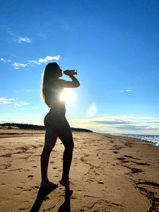 A captivating beach sunset scene featuring model S, from Canada. In the frame, she is silhouetted against the backdrop of a setting sun on the sandy beach, embodying the tranquility and beauty of the moment.