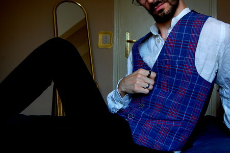 A bearded, mustachioed man with tattoos on his neck, sporting a plaid vest and a casual style. OnlyFans: ShadesOfS. Adult content for mature audiences.
