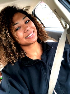 A woman with curly hair, smiling and looking over her shoulder while sitting in a car. She appears to be in casual attire. The image is taken during the daytime.