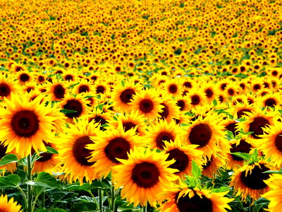 This image showcases a beautiful and vibrant sunflower field under a clear sky. The sunflowers are in full bloom, with their bright yellow flowers standing out against the green of the plants. The field is dense with these flowers, creating a striking contrast. This image captures the essence of nature in its most vivid form.