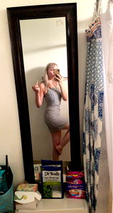 A bathroom mirror selfie of OnlyFans model Silver Kitten, captured in a moment of candid intimacy. The image showcases her reflection with one hand on her hip and the other on her knee, exuding confidence and sensuality. The background reveals a bathroom setting, adding an element of casual comfort to the overall composition.