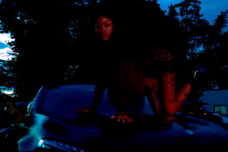 Exclusive OnlyFans model photoshoot, featuring a captivating model in a striking red lingerie set against a nighttime backdrop with neon lights. The model's confident pose and unique attire make this image stand out.