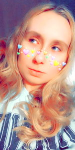 A candid, blurry selfie of a young woman with her hair up, wearing a colorful top. She has a thoughtful expression and is indoors. The image has a soft focus effect.
