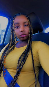 Sky M, an OnlyFans model, is seen from above in the driver's seat. She has long braided hair and a relaxed posture as she poses for her followers on social media.