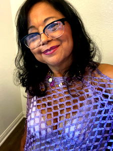 The woman is wearing a purple dress and has her hair styled. She's smiling at the camera with one hand on her hip. Her makeup is done, and she appears to be enjoying the moment.