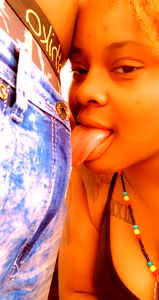 The sultry SmooveNGoldielocs, a Southfield MI OnlyFans model, is captured in this image. She's seen licking the back of a person in jeans, her tongue playfully on their skin. The image radiates an air of intrigue and allure.
