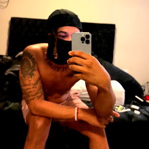 This is an image of a shirtless individual taking a mirror selfie, showcasing their tattooed mask and holding a phone. The person has tattoos on their arms and torso, and appears to be indoors with a black surface behind them, possibly a bed or a piece of furniture. They have visible facial hair and are wearing a black beanie. The pose suggests a casual, self-expressive moment captured.