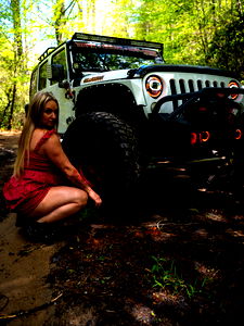 Model 'Southern Belladonna' poses confidently with her tatoo-covered arm and thigh. She is wearing a red and white bikini top, showcasing her tattoo sleeves and midriff tattoos. Her hair is styled in loose waves and she gazes directly into the camera. The background consists of trees and a clear sky, suggesting an outdoor setting like a forest or park.