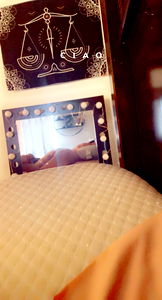 Diabla, a stunning OnlyFans model, captures her reflection in a large mirror. She's seen wearing a pink top and black pants. The room is softly lit with a warm ambiance.