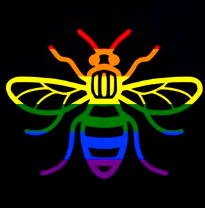 A vibrant honeycomb design with the iconic rainbow pride flag colors, set against a stark black background. The bee, symbolizing hard work and dedication, is depicted in this emblematic image.