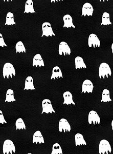 The image showcases a model adorned with a playful ghost pattern, celebrating the festive spirit of Halloween. The model is set against a stark black background, which accentuates the white and gray hue of the ghosts, creating a striking contrast.