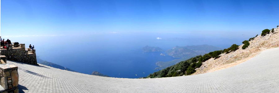 An expansive view of a mountainous landscape, featuring a steep cliff with people at the bottom and an overview of a valley below. The photo has been taken from a high vantage point, offering a panoramic perspective.