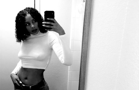 A young woman with curly hair is seen in a casual pose, leaning against a mirror. Her relaxed stance and the informal setting suggest a candid, intimate moment.