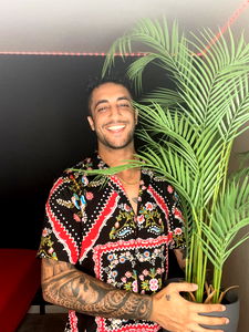 A humorous take on a man holding a fake palm tree, set against a cozy backdrop. He sports a floral shirt and is known for his comedic content.