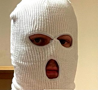 The image features a model wearing a mask with holes for eyes, covering the lower face, and a white hoodie. The mask is reminiscent of those used in certain security contexts and has a textured appearance. The hoodie appears to be cropped around the waist, suggesting it might be part of a costume or themed fashion ensemble. The model is looking directly at the camera, which adds an element of engagement with the viewer. The background is nondescript and does not detract from the focus on the mask and hoodie.