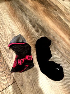 This image features a pair of black socks adorned with pink text, placed side by side on a brown wooden floor. The socks are arranged neatly, suggesting they might be new or recently worn. The color contrast between the black socks and the brown wooden floor creates a visually appealing scene.