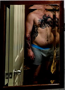 This image captures a moment of candid reflection. The man, identifiable as Superman on OnlyFans, is standing in front of a full-length mirror with his tattoos and underwear visible. He appears to be in a room with a wooden door, suggesting an indoor setting. His pose suggests he may be in the middle of dressing up or undressing, with one arm resting behind him and the other casually by his side.