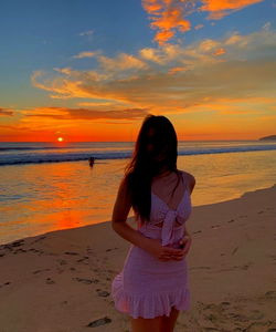 The image showcases a beautiful beach sunset with the stunning model Sherrylรผ as the focal point. She is standing on the sandy beach, her gaze directed towards the horizon, capturing the essence of a tranquil evening by the ocean.