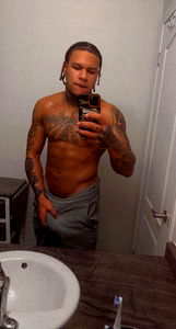 Swaii, the popular OnlyFans model, shares a glimpse into his personal life with this candid bathroom selfie. The image captures Swaii in an intimate moment, showcasing both his tattoos and his athletic physique. With the phone held casually in one hand and the other resting on his hip, he exudes confidence and charm.