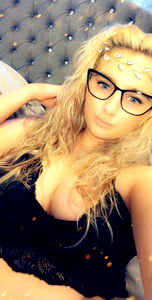 This image features a woman posing in lingerie, sitting on a couch with one arm resting on her thigh. She has long blonde hair and is wearing glasses. Her attire includes a black tank top and the lighting in the photo suggests it's taken indoors. The background is neutral with no distinctive features or objects.