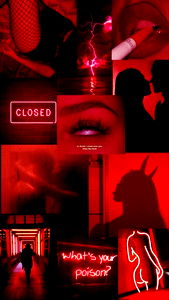 A vibrant collage showcasing a photoshoot of OnlyFans model Sweetpeach in a striking red theme. The images feature bold red hues, contrasting with darker background elements and the model's silhouette against a neon sign. Each image tells a story of its own while contributing to the overall aesthetic of the collage.