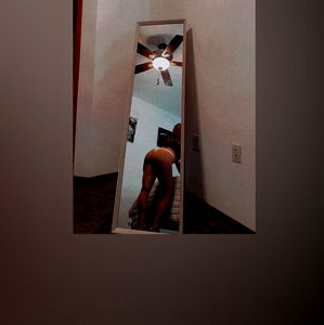 Catching a glimpse of her reflection, the OnlyFans model Tattedblondiee captures a moment in front of a mirror. The image is framed by a white border with black text, adding an artistic touch to the photo. The model's pose and expression suggest confidence and style.