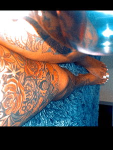In this image, the tattooed leg of OnlyFans model Pretty Tee is captured, showcasing her unique style and the detailed artwork on her skin. The photo appears to be taken in an indoor setting with a carpeted floor visible in the background. Please note that the content of the image may not be suitable for all audiences.