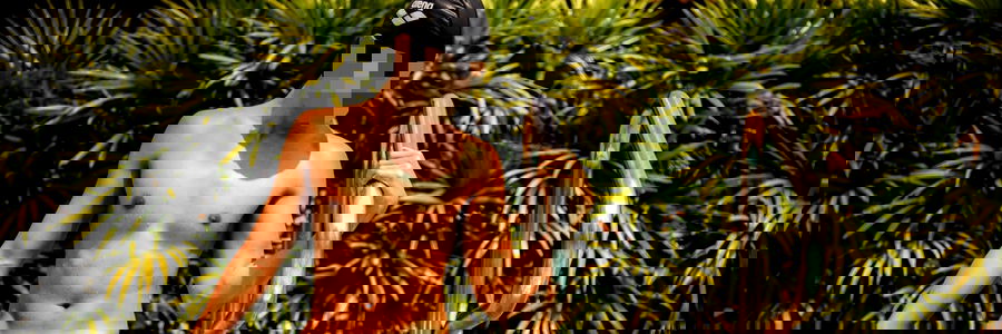 The image depicts a muscular man in swim trunks, standing near a pool or body of water. He is looking directly at the camera with a neutral expression.