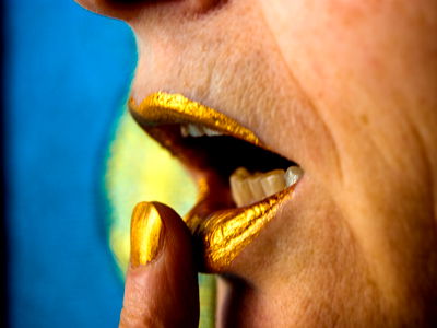 This image features a close-up of a person wearing gold lipstick, which gives off a metallic look. The individual appears to be engaged in the act of applying more of this unique lip color. The background is nondescript and does not distract from the subject of the photograph. It's an artistic representation with a touch of realism.