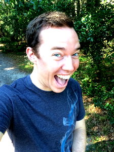 A young adult male, Michael, shares a moment of joy during his walk. He is caught mid-laugh, expressing delight at his surroundings.