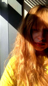 The image is a portrait of an individual with long blonde hair. They are wearing a yellow top and are standing outdoors under sunlight. The person has a slight smile and appears to be looking at the camera.