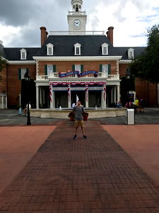 A person stands at the entrance of an elaborate model train exhibit, with a vintage-style station and track in the background. The signage suggests this is a local attraction or museum. The setting is outdoors, during daylight hours.