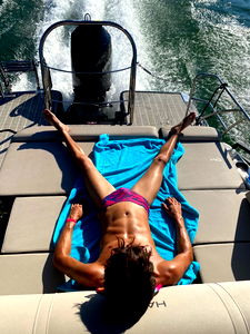 An OnlyFans model named Tyler James from Cincinnati is enjoying a sunny day on a speedboat by taking off his shirt and lounging comfortably in a relaxed position. The boat's speed seems to be high, as indicated by the water spray in the background. The man has tattoos visible on his left arm.