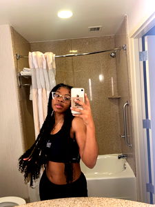 The image features a woman with braided hair, wearing a sleeveless top and a chain necklace. She's in an indoor setting, possibly a bathroom given the blurred background that includes what appears to be towels. Her expression is neutral and she's looking directly at the camera.