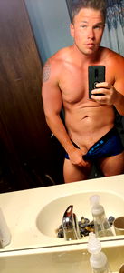 A shirtless man taking a mirror selfie, showcasing his physique and confidence. He is standing in front of a bathroom mirror with a casual expression on his face.
