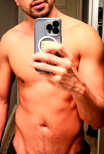 A man with a chiseled physique is captured taking a mirror selfie in a bathroom. He appears to be shirtless, flexing his muscles, and posing for the camera. The image suggests a fitness-oriented theme.