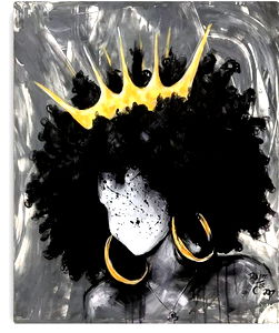 A striking piece of art, featuring a female figure with large earrings and an elaborate crown headpiece. The use of monochromatic tones gives this artwork a bold and dramatic feel. A perfect blend of fashion and fantasy.