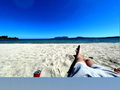 A photoshoot of the OnlyFans model known as the Greek God of Pleasure on a beach. The model is captured in a candid moment, holding a beverage and looking towards the camera.