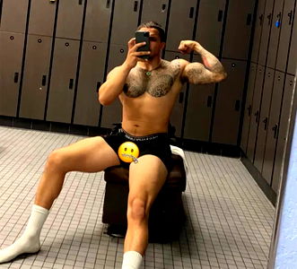M.M, the renowned Onlyfans model, showcases his chiseled physique and tattooed arms in a bathroom mirror selfie.
